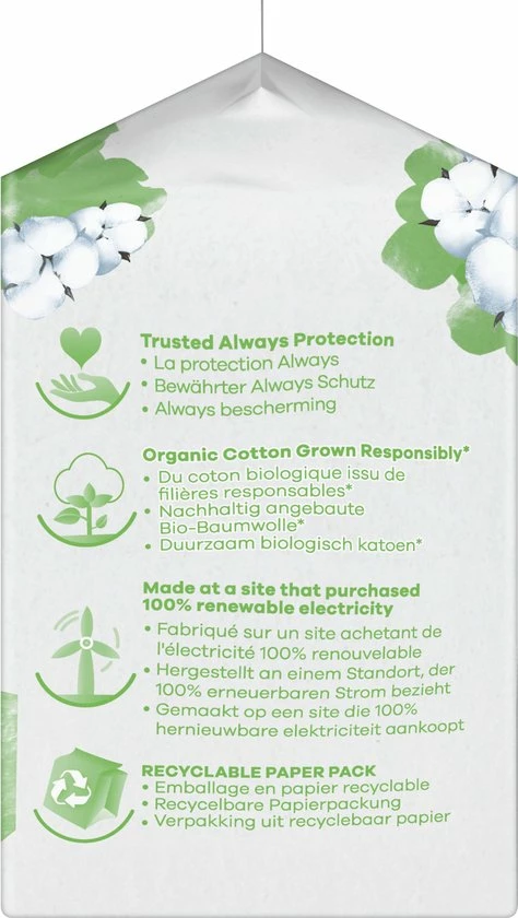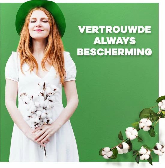 Always maandverbanden bieden betrouwbare bescherming met een toplaag van 100% biologisch katoen