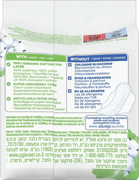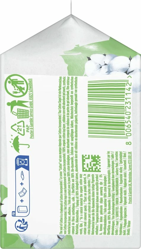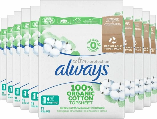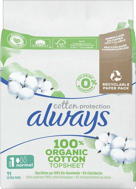 Always Cotton Protection maandverband zorgt voor jou en het milieu met een toplaag van 100% biologisch katoen in een recyclebare papieren verpakking. Het maandverband bevat geen parfum, geen kleurstoffen en geen chloorbleekmiddelen. Het maandverband is goedgekeurd door dermatologen van SHA (Skin Health Alliance) en gecertificeerd door Cotton Inc. Het katoenen maandverband heeft een ultra absorberende kern dat vocht omzet in gel om je de vertrouwde Always bescherming te bieden. Always Cotton Protection maandverbanden Normal zijn ideaal voor een lichte menstruatie met lingeriemaat S en M of voor een gemiddelde menstruatie met lingeriemaat S.