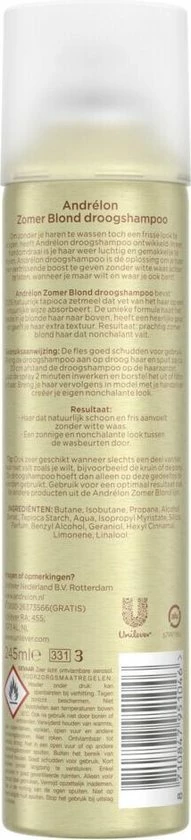 Andrlon Zomerblond DroogshampooDe Zomer Blond droogshampoo is speciaal voor normaal tot vet haar dat tussen de wasbeurten door wel een flinke opfrisser kan gebruiken. Maar het product is niet alleen geschikt voor een verfrissende boost tussen de wasbeurten door, het kan ook gebruikt worden als stylingsproduct. De formule zorgt ervoor dat het vet bij de haaraanzet opgenomen wordt, op deze manier voelt het haar weer schoon en gewassen aan. Na het gebruik van de droogshampoo heeft je haar weer zijn pure, krachtige en luchtige volume terug zonder het te wassen.
