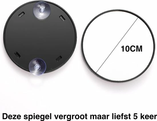De spiegel heeft een diameter van 10 CM en kan opgehangen worden door middel van de zuignapjes aan de achterkant.