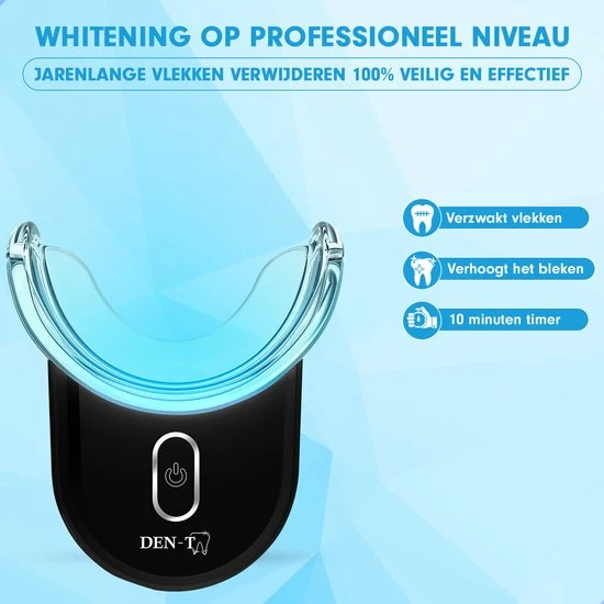 De DEN-Tยฎ U-shape tandenbleker bevat de nieuwste 32LED technologie waardoor u thuis hetzelfde resultaat kunt behalen als bij een tandenbleeksalon. Bij een tandenbleeksalon dien je meerdere sessies van 20 minuten te doen met hiertussen 10/15 minuten rust te nemen. Dit zorgt ervoor dat je snel al een halve dag hiermee bezig bent. Met de U-shape tandenbleker van DEN-T kan je elke dag een sessie van 10 minuten doen wanneer dit jou uitkomt!