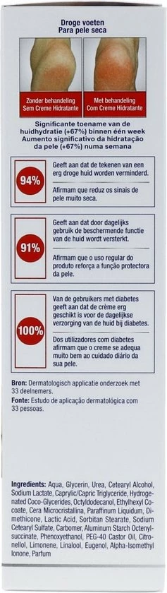 | IngrediΓ«nten | IngrediΓ«ntenAqua, glycerine, urea, cetearylalcohol, natriumlactaat, capryl/caprinetriglyceride, octyldodecanol, ethylhexylcocoaat, gehydrogeneerde, kokosglyceriden, cera, microcristallina, paraffinum, liquidum, dimethicon, melkzuur, PEG-40, ricinusolie, sorbitaanstearaat, natriumcetearylsulfaat, zetmeelaluminium-octenylsuccinaat, carbomeer, fenoxyethanol, linalool, citronellol, limoneen, alfa-isomethylionon, eugenol, parfum. |