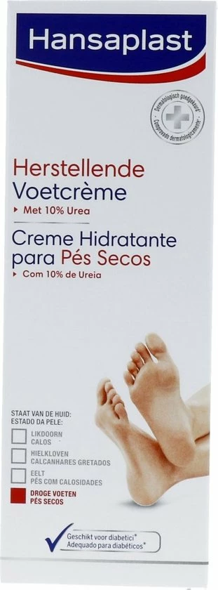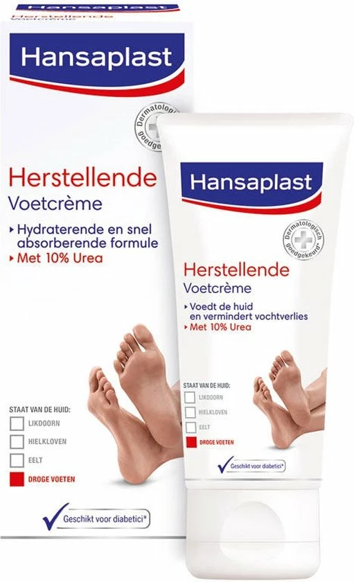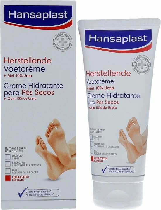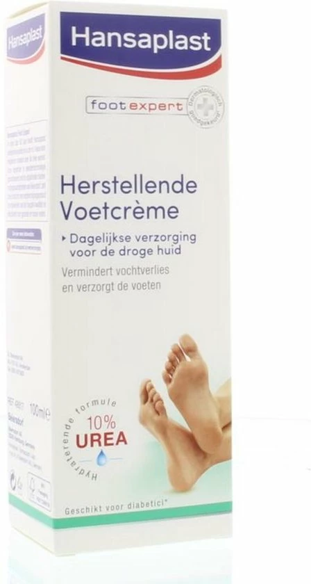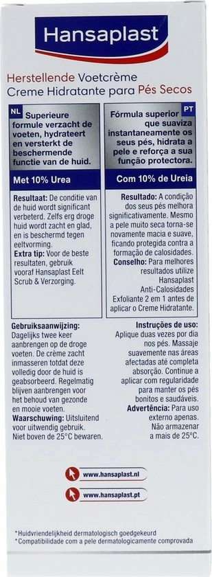 Hansaplast Herstellende Voetcrème vermindert de droge, ruwe huid en verzacht de voeten onmiddellijk. De intensieve hydraterende formule met 10% Urea werkt tegen vochtverlies en versterkt de beschermende functie van de huid. Hansaplast Herstellende Voetcrème is licht geparfumeerd en wordt snel opgenomen in de huid. Het effect op de huid is dermatologisch goedgekeurd. Bij regelmatig gebruik wordt de conditie van de huid significant verbeterd waardoor de voeten er gezond en mooi uitzien.