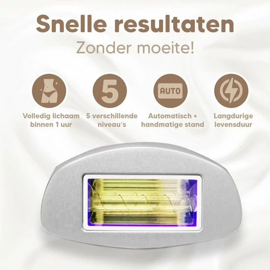 Wees eindelijk af van die hele scheer of ontharings routine na 3 fases (8 weken). Na het eerste gebruik zal het oude haar eraf vallen na 2 weken, in de 4 weken daarop zal het nieuwe haar eraf vallen en in de 2 weken daarna zal je huid glad zijn of nog hele kleine dunne haartjes bevatten.