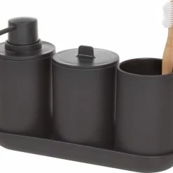 Een badkamer organizer voor veelzijdig gebruik. Het bevat één open bakje voor tandenborstels, één bakje inclusief deksel voor wattenschijfjes en één zeephouder. De zeephouder is opnieuw te vullen met je favoriete zeep door het pompje er van af te halen. Deze drie items staan op een schaaltje waar je ze ook vanaf kunt halen.