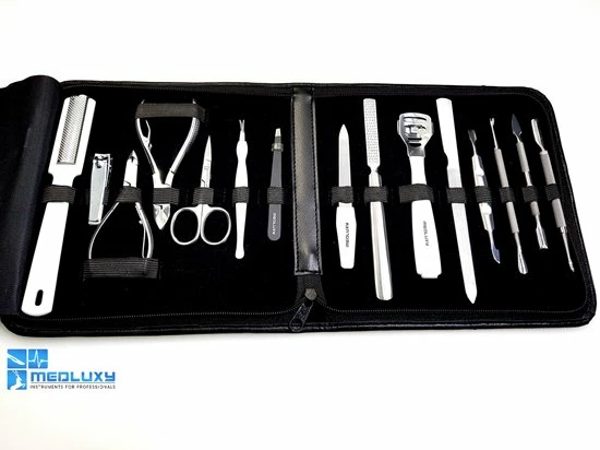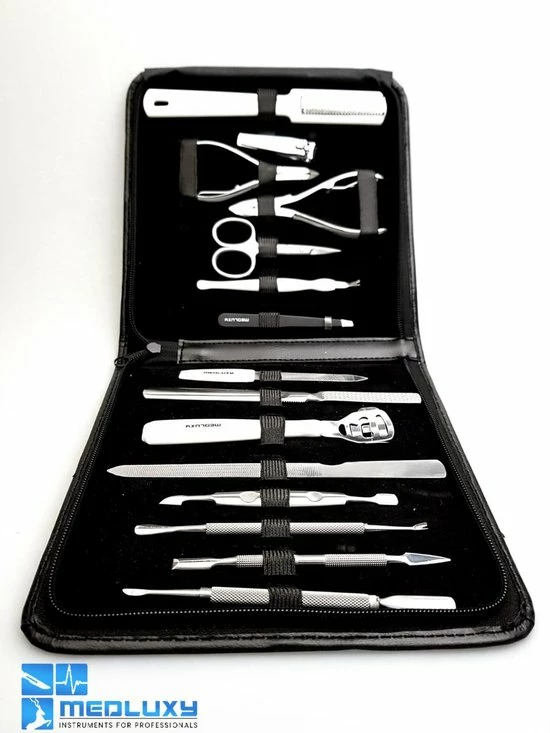 VOORDEEL PAKKET – waarde meer dan β¬ 150,- . Handige MEDLUXY pedicure / manicure set inclusief etui. Samengesteld door onze professionals voor goed uitziende nagels. Bestaat uit 15 verschillende instrumenten. Ideaal voor pedicure en manicure. De instrumenten zijn met de hand gemaakt van hoogwaardige kwaliteit roestvrij staal.