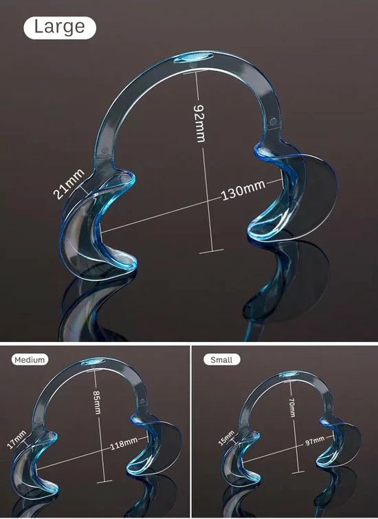 Professionele mondspreider voor tanden bleken. Breng de mondspreider voorafgaand aan de bleekbehandeling aan in de mond van de klant. Dit zorgt voor een makkelijk toegankelijk werkgebied tijdens de bleekbehandeling. De mondspreider is flexibel waardoor je deze eenvoudig in kunt brengen bij de cliΓ«nt of patiΓ«nt zonder enige vorm van discomfort. Goed te gebruiken door tandartsen of personen die tanden bleken.