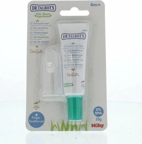 De tandpasta gel voor baby van NΓ»byβ’ is gemaakt uit natuurlijke ingrediΓ«nten en Citroganixβ’. Ze is speciaal ontworpen om tandjes en tandvlees van babyβs tussen 4 en 24 maanden veilig schoon te maken. Het is veilig indien ingeslikt, en is effectief tegen bacteriΓ«n die tandbederf veroorzaken dankzij de Citroganixβ’. Dankzij het bijgeleverde vingertandenborsteltje leert u uw kind een goede mondhygiΓ«ne te hebben. De silicone massagevinger plaatst zich op uw vinger. De kleine silicone massageborsteltjes laten toe zacht de eerste tandjes van je kleintje te borstelen en het tandvlees te masseren.