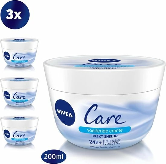 NIVEA Care Voedende Crème de ideale verzorging van top tot teen. De wow formule met verzorgende hydrowax is 100% voedend en 0% plakkerig. De formule verrijkt met verzorgende hydrowax trekt onmiddelijk diep in de huid. De huid wordt 24 uur lang intensief gevoed zonder vet aan te voelen.